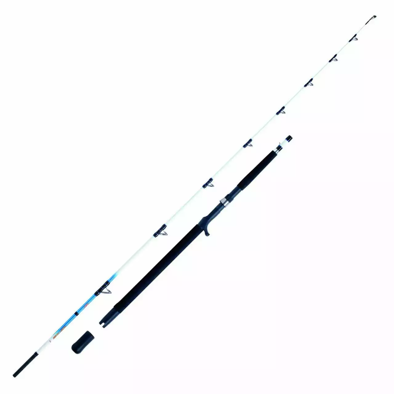 Mit der abgerundeten, enfternbaren Abschlusskappe, dem Kreuzabschluss, sowie dem Moosgummi Rutengriff und Kampfgriff sorgen diese Meeres-Kampfruten für einen angenehmen Einsatzkomfort in jeder Situation und leifern eine exzellente Kraftübertragung im Drill, die selbst mit großen Meeresgiganten spielend fertig wird!